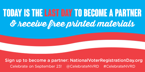 Don't miss your last chance 2 become a partner to #CelebrateNVRD & get free printed materials! http://www.NationalVoterRegistrationDay.org pic.twitter.com/MKtdIlmrw2