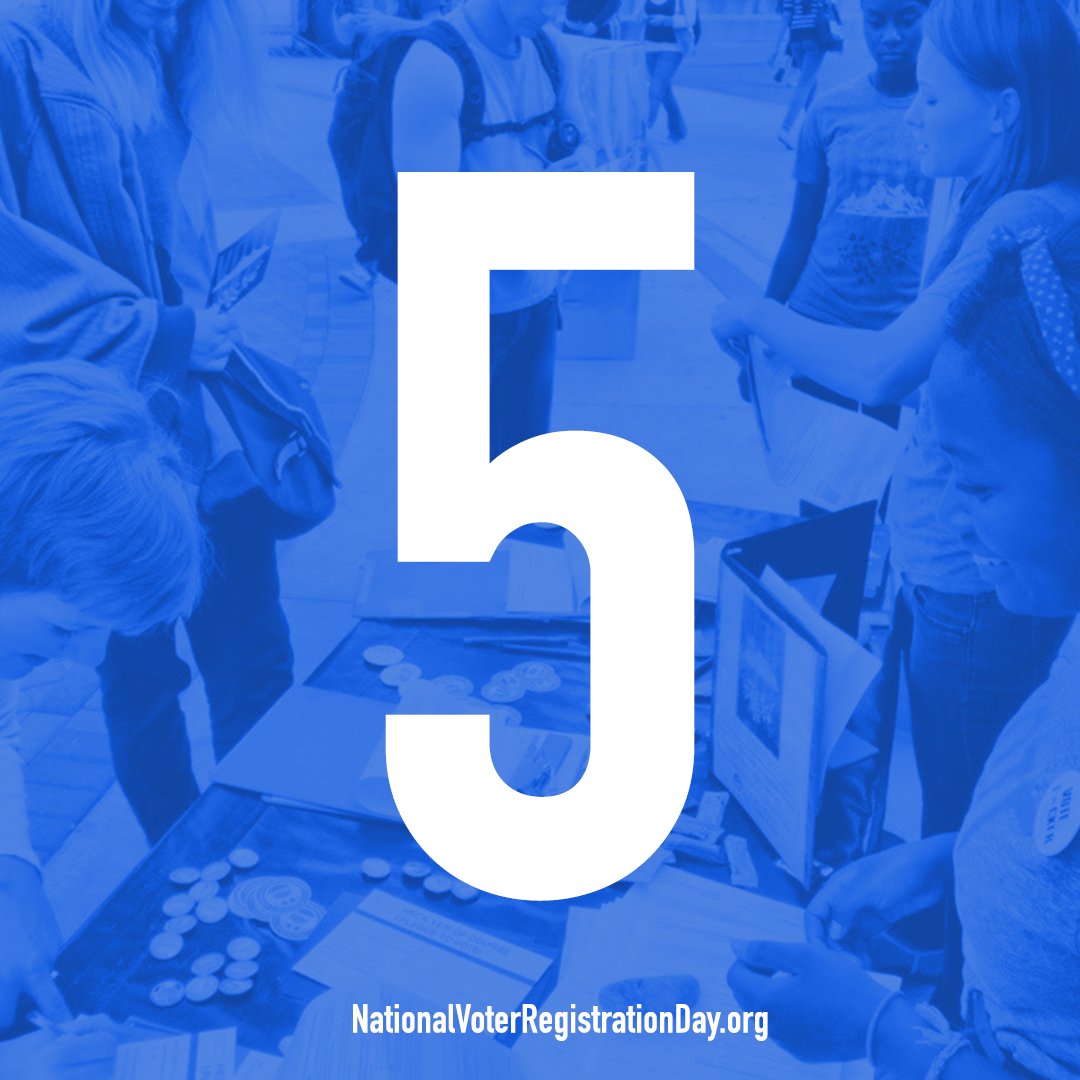 5 days left to share #NationalVoterRegistrationDay, 9/26, with your friends, family, and community! Find events: http://ow.ly/uvzc30f5YWV pic.twitter.com/lGC2NzB1iR