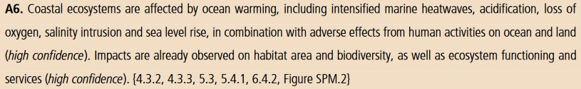 Kystøkosystemer påvirkes av oppvarming, mer intense marine hetebølger, forsuring, oksygentap, oversvømmelse av saltvann og havstigning, samt andre konsekvenser av menneskelig aktivitet i hav og på land. Dette påvirker biologisk mangfold og økosystemer (høy sikkerhet). 5/ #SROCCpic.twitter.com/9eS7q7DTD2