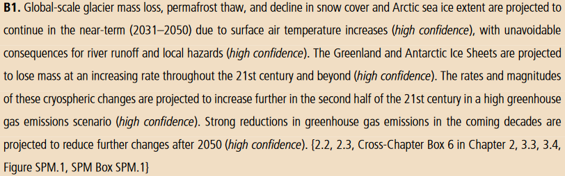 Is i Grønland og Antarktis vil fortsette å smelte i resten av århundret og fremover. Dette vil skje raskere hvis vi ikke kutter utslipp nok (høy sikkerhet). 7/ #SROCCpic.twitter.com/X3qkt6wbV5
