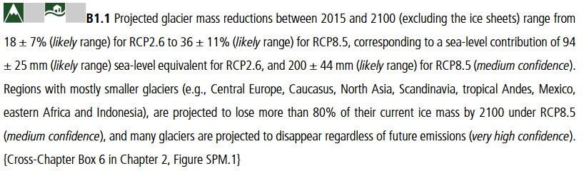 Isbreer vil før 2100 smelte mellom 18 (±7) og 36 (±11) %, som vil bidra til havstigning mellom 0,94 (±0,25) og 2 (±0,44) meter, avhengig av hvor mye vi kutter utslipp. Regioner med små isbreer kan miste 80 % is hvis vi ikke kutter utslipp. Mange vil forsvinne uansett. 8/ #SROCCpic.twitter.com/mbfs26ZvHJ