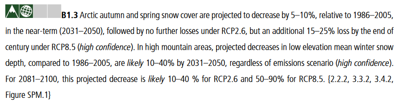Snødekke i høsten og våren vil reduseres 5-10 prosent (i forhold til 1986-2005) mellom 2031 og 2050. Det kan reduseres ytterligere 15-25 prosent før 2100 hvis vi ikke kutter utslipp nok (høy sikkerhet). 10/ #SROCCpic.twitter.com/bn3f3ftaH7