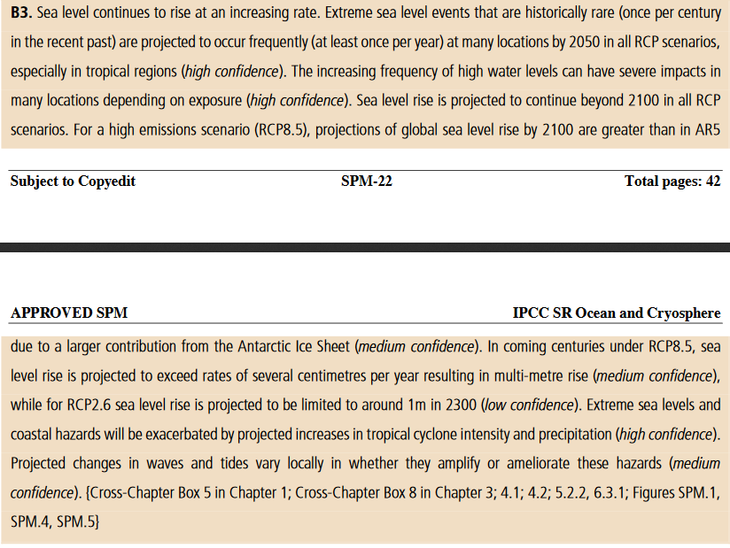 I lavutslippsscenarioer vil havene i snitt globalt i årene 2081-2100 stiger 0,39 (0,26-0,53) meter, og 0,43 (0,29-0,59) meter i 2100, sammenlignet med 1986-2005. I de verste scenarioene vil de stige 0,71 (0,51-0,92) meter i 2081-2100 og 0,84 (0,61-1,10) meter i 2100. 13/ #SROCCpic.twitter.com/PImkXANUTo