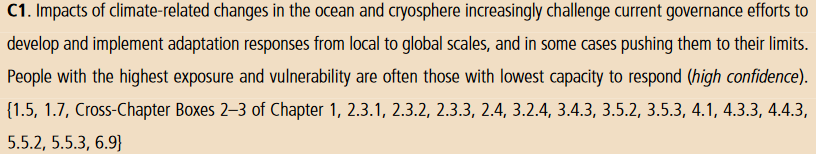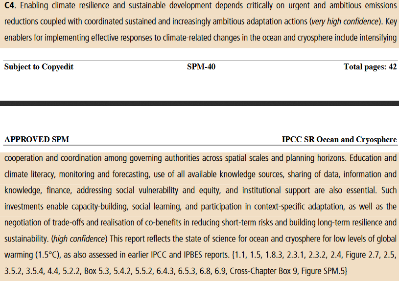 De meste sårbare og utsatte menneskene er ofte de som har lavest kapasitet til å reagere. Tilpasning er en stor utfordring fra lokalt til globalt nivå. Tilpasning og bærekraftig utvikling avhenger av raske og dype utslippskutt (veldig høy sikkerhet). 18/ #SROCCpic.twitter.com/wZCIFCkzSD