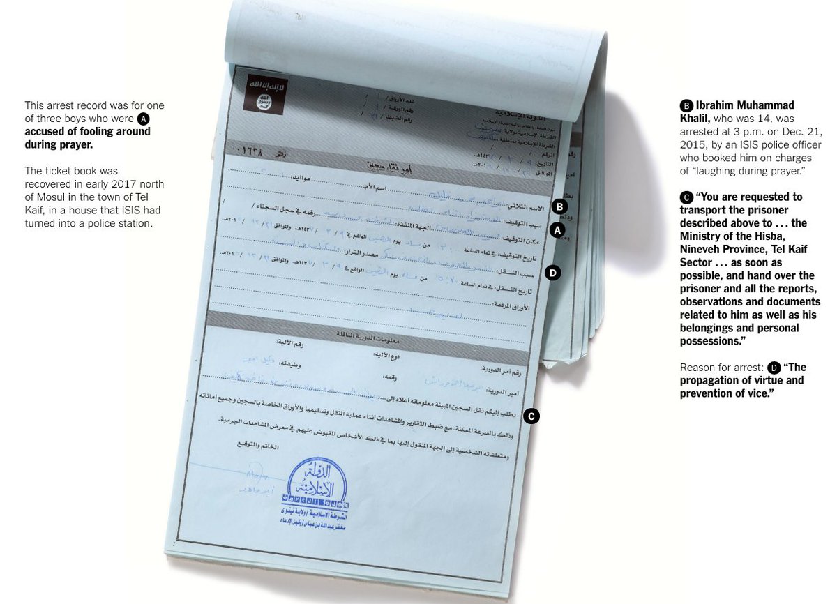 @rcallimachi's latest: As Mosul fell, she went there and collected 15,000+ ISIS documents that show how the group was running territory. This is an arrest record for fooling around at prayer. Alt title for this piece: ISIS Dumpster Dive https://www.nytimes.com/interactive/2018/04/04/world/middleeast/isis-documents-mosul-iraq.html …pic.twitter.com/UHLuvA1UL9