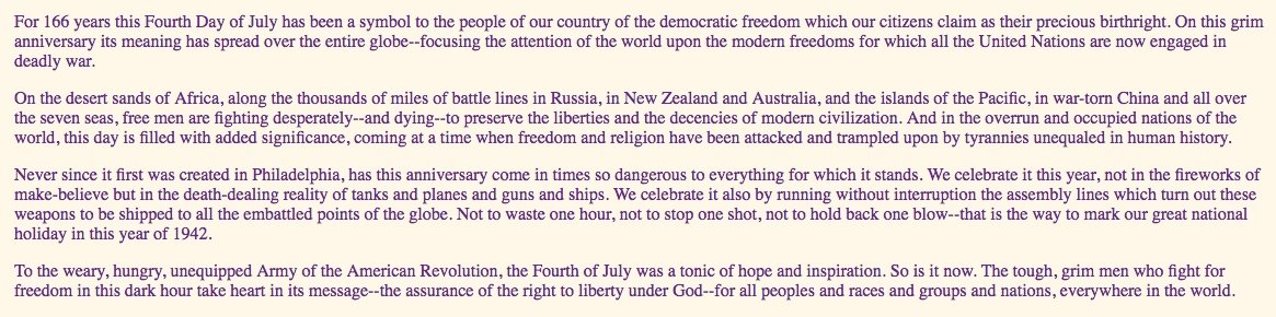 FDR's Independence Day message, July 4, 1942 http://gurukul.american.edu/heintze/Roosevelt.htm …pic.twitter.com/LmHGLAyhbA