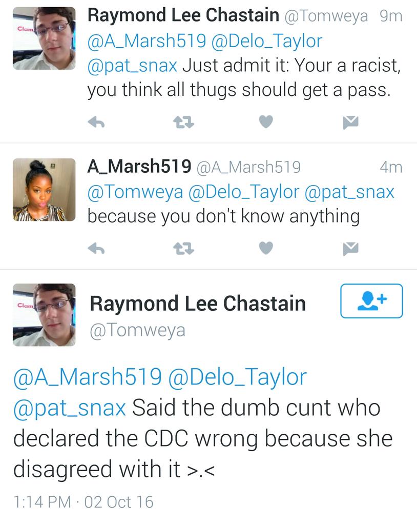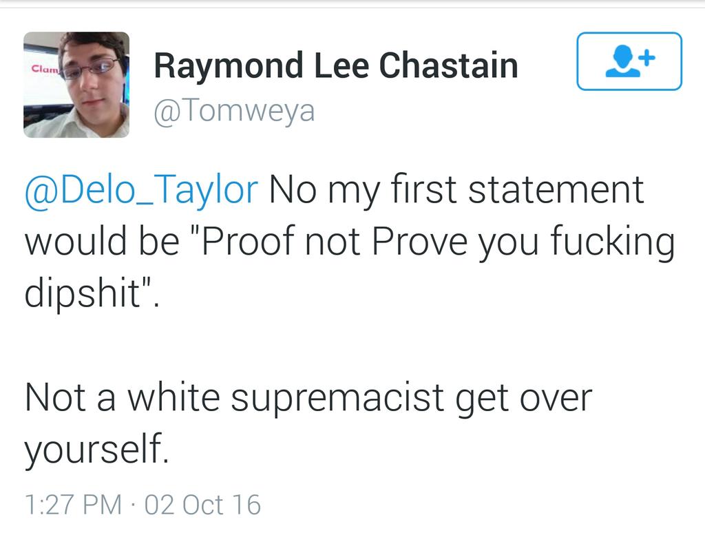 "Black men = Illiterate thugs/rapists Black women = C**ts Me = Not racist." - Suspected White Supremacist @Tomweya pic.twitter.com/CpTiLLyyPW