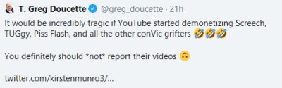 I think best contact @TeamYouTube being what poor greggy is trying would be considered Cyberbullying.. such a petty thing for a claimed Lawyer