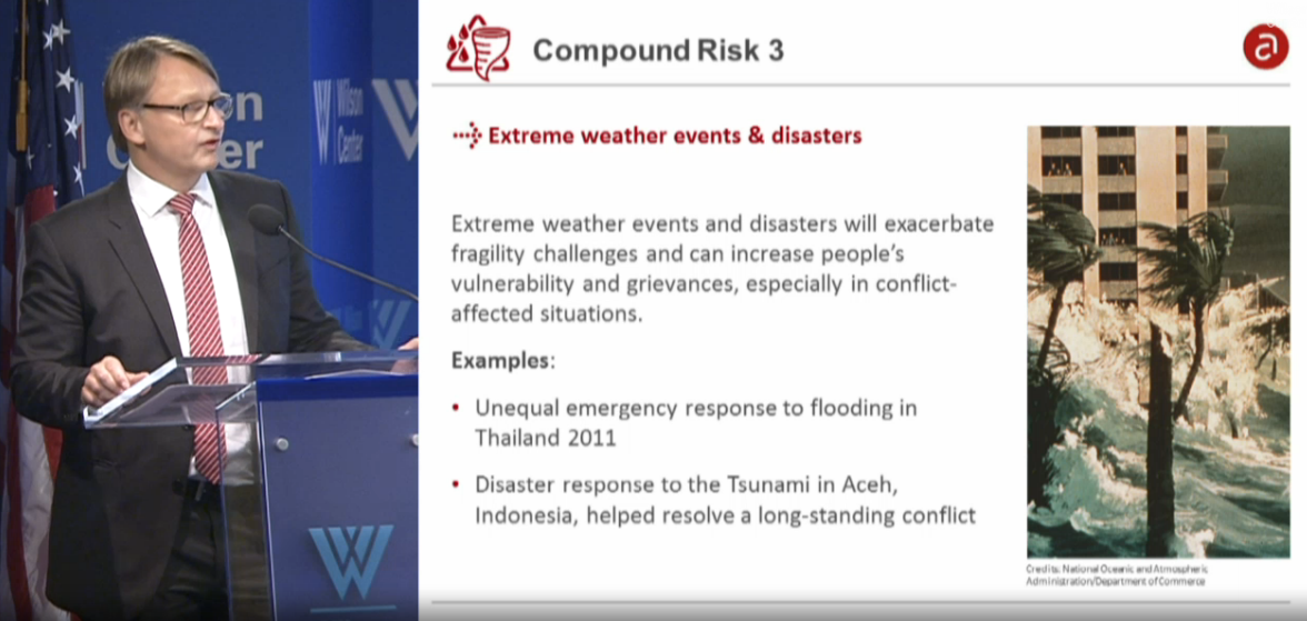 3rd risk: extreme weather events/disasters can increase vulnerability, esp. in conflict-affected areas #Climate4Peacepic.twitter.com/qfY4SC72H7