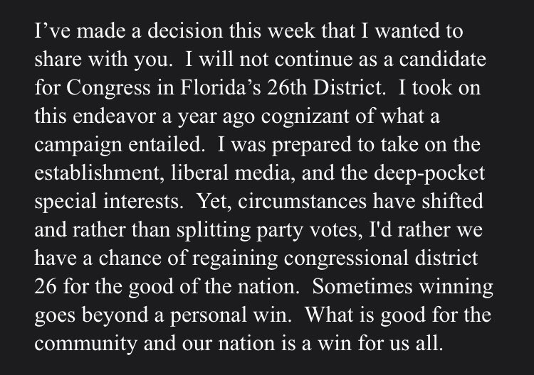 She raised less than $10K in the first quarter of the year, and @MayorGimenez is the overwhelming favorite to win the primary. Question was more when than if she would drop outhttps://www.google.com/amp/s/amp.miamiherald.com/news/politics-government/article239689858.html …