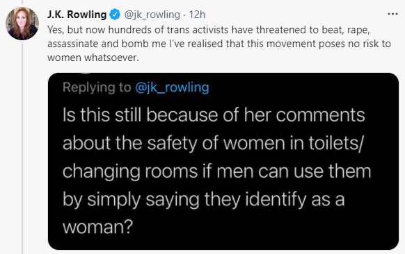 JK Rowling - if you want to paint trans women as dangerous because you’ve received some threats, logically I can do the same, right? This is what your ‘movement’ is doing to trans people…pic.twitter.com/scNGaDLiHp