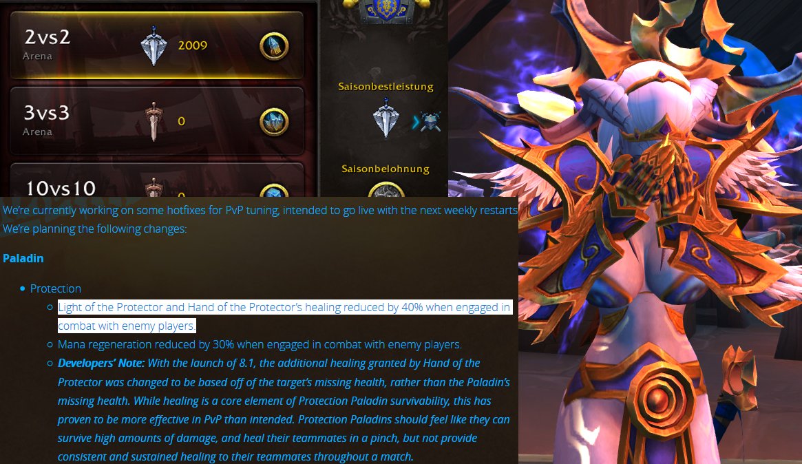 Well, RIP Prot Paladins in Arena. Although I understand why Tanks should not be high rated in Arena, it was my only motivator to play rated PvP. But yeh, i already got the Elite set. So my only challenging content will be Myth+ from now on :< #Priskah #PvP #TankNerf #Warcraftpic.twitter.com/C7UoM4HcBE
