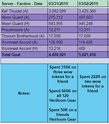 I did very quick math here but I believe I made 635K gold this month that is profit! The you can see below I spent more than that number. - Spent 666K on Heirloom Gear this month - Spent about 500K on friends returning to wow. So I lost about 500K! Time to make that all back! pic.twitter.com/dnWrl6ITZG