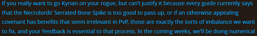 Some persons like to play different parts of the game - we are encouraged to. If a covenant is good for my class in PvE, but bad in PvP (e.g. Numbers would show that another covenant would be 5% better in PvP), that doesnt feel good.