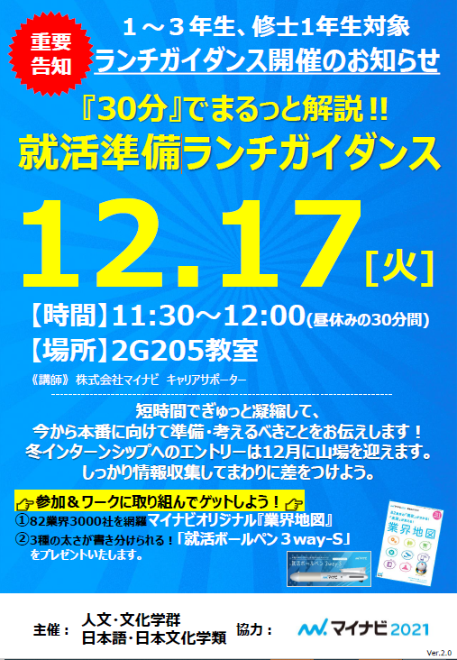【就職準備ランチガイダンス】日本語・日本文化学類1~3年生を対象として、添付ポスターの通り就職準備ランチガイダンスが開催されます。 お昼休みの開催です。ぜひご参加ください。 日時:12月17日(火)11:30~12:00 場所:2G205教室 講師:株式会社マイナビ キャリアサポーターpic.twitter.com/xqJbgYRs1I