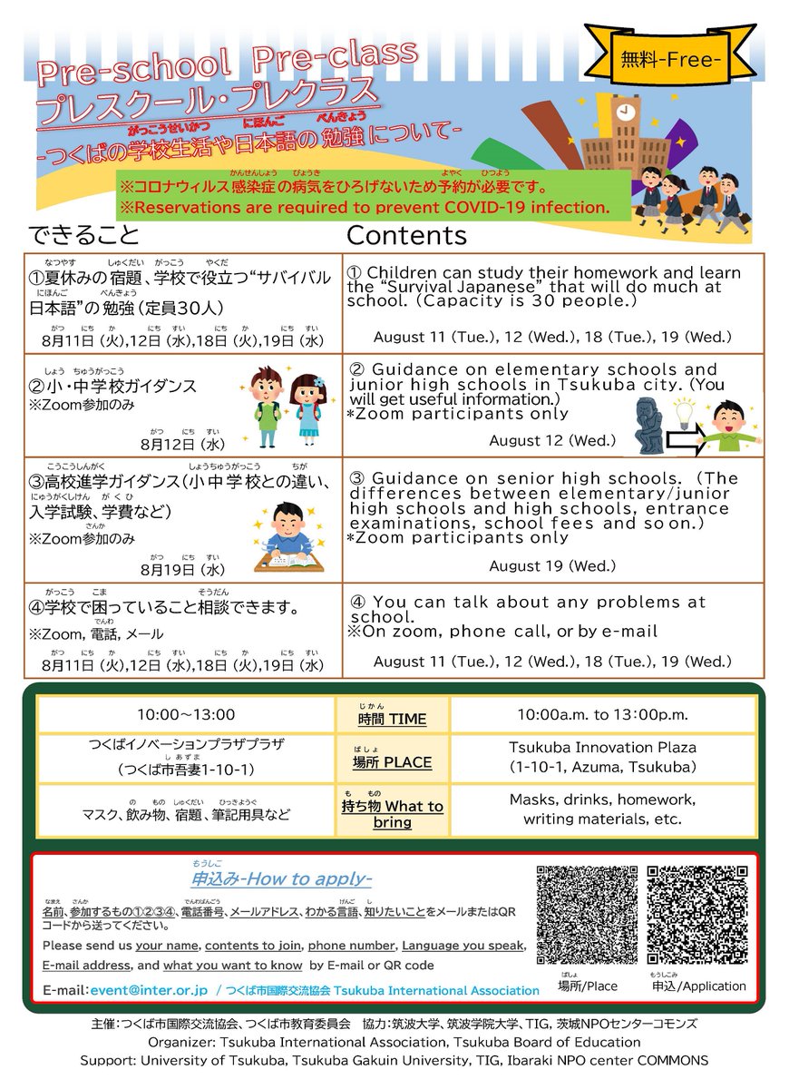 つくば市外国人児童生徒プレスクール・プレクラス(要予約) 時間:10:00-13:00 場所:つくばイノベーションプラザ ①夏休みの宿題、学校で役立つ“サバイバル日本語”の勉強(30人:8月11,12,18,19日) ②小・中学校ガイダンス(Zoom:8月12日) ③高校進学ガイダンス(Zoom:8月19日) などpic.twitter.com/B40FtJILmL