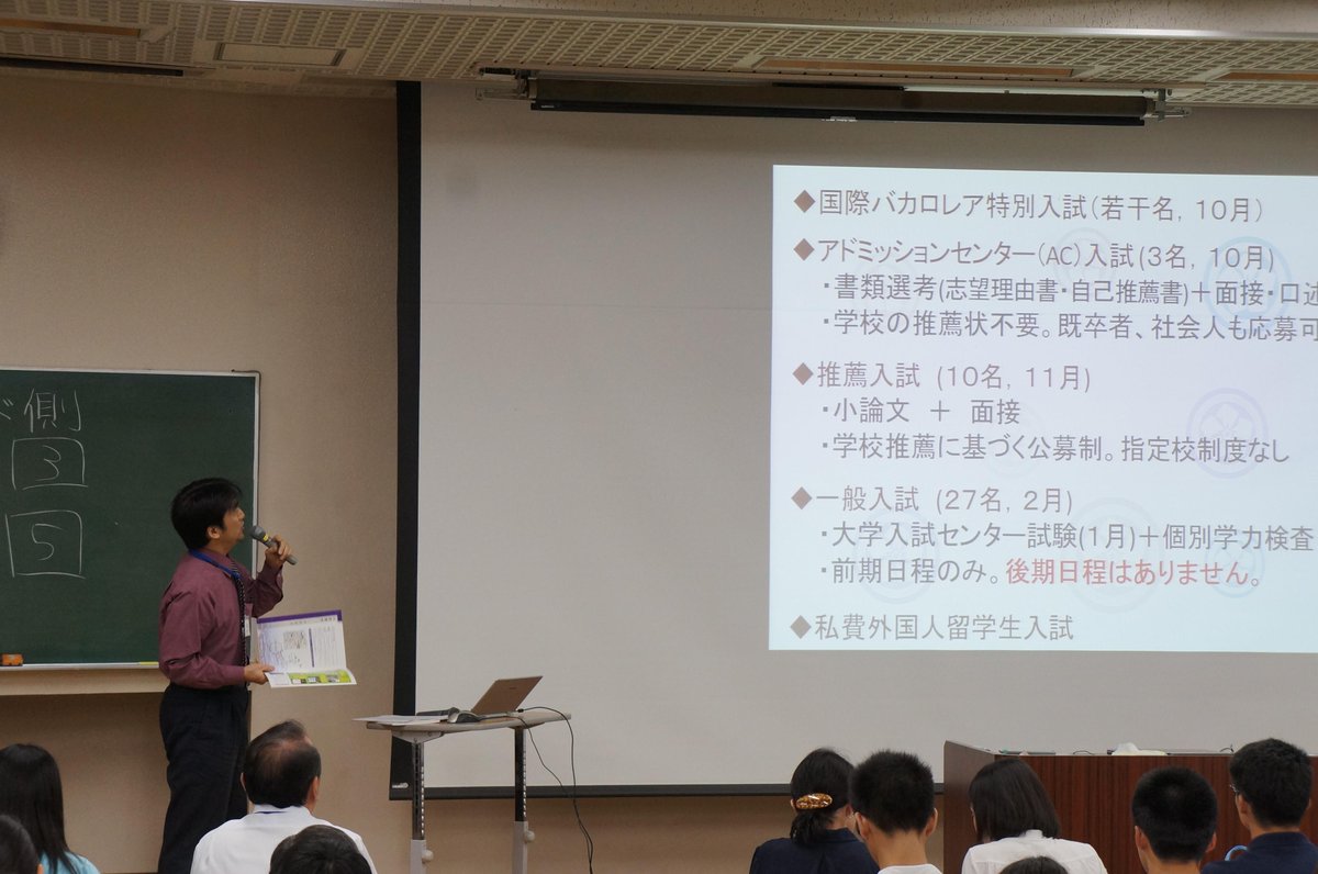 次に入試の説明。日本語・日本文化学類は大きくAC入試、推薦入試、一般入試(前期日程)の3つを用意しています。それぞれに入試の特色と求める人材が違います。複数方式で受験することもできるので、チャンスを最大限に生かして受験してください!pic.twitter.com/aeVbqXcZxA
