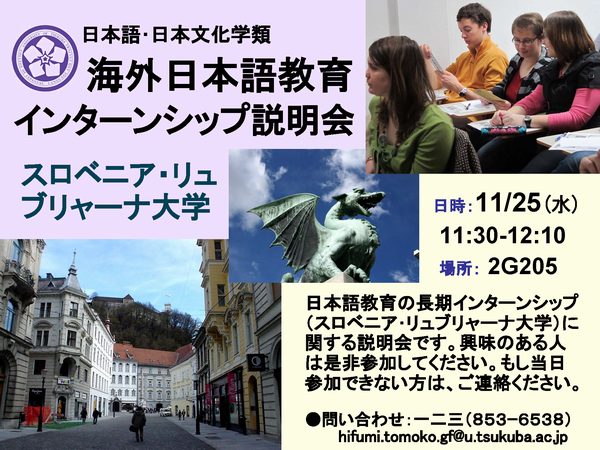 11月25日(水)に日本語教育インターシップ説明会を行います(11:30-12:10、2G205教室)。実施機関はスロベニアのリュブリャーナ大学です。詳細http://www.japanese.tsukuba.ac.jp/document/20151125slovenia.pdf …。詳しくは一二三先生まで。pic.twitter.com/rIm2t1JI9I