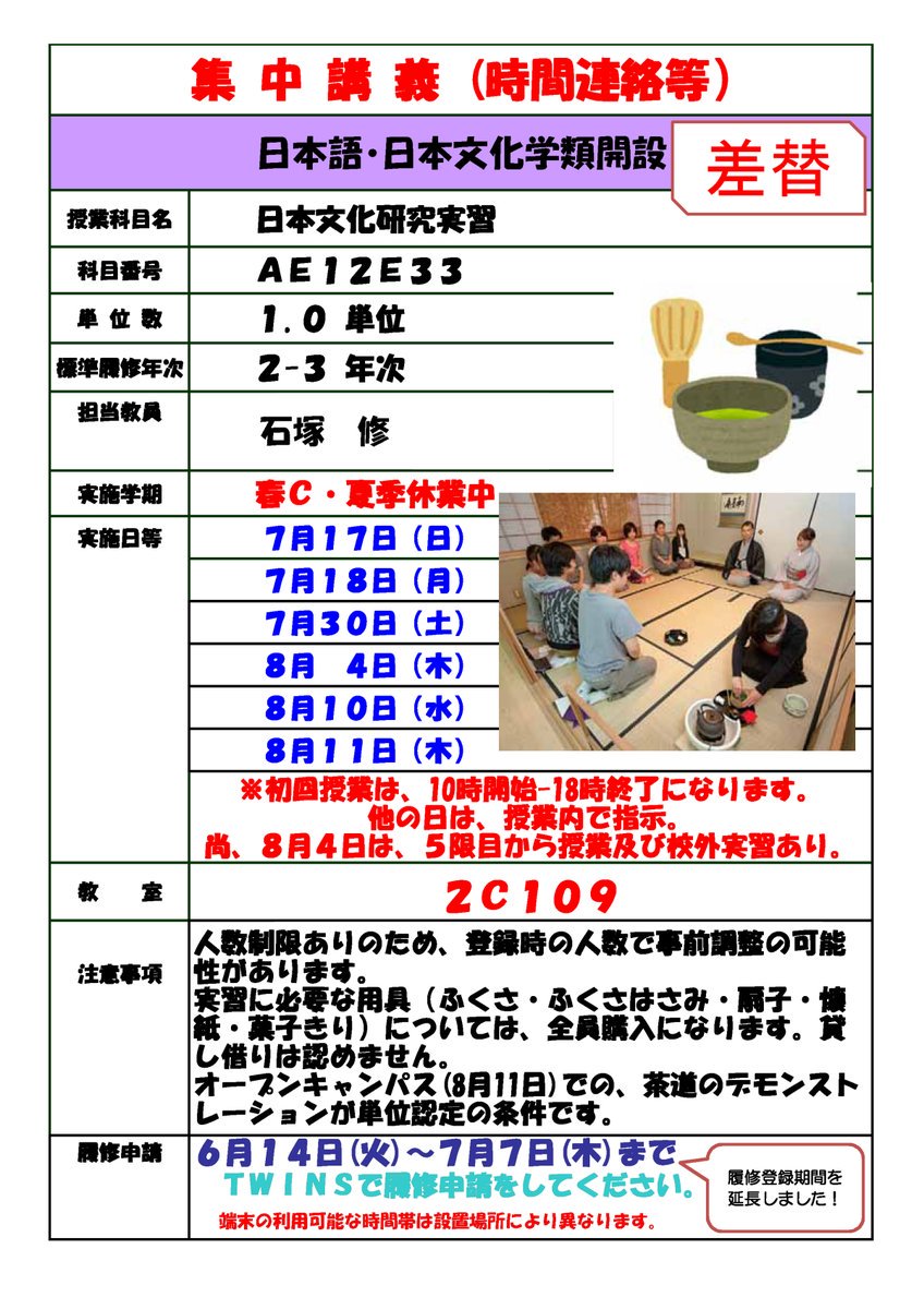 【日日学類/集中講義】 履修登録期間 明日(7月7日)まで! 科目名:日本文化研究実習(日日学類のお茶室で行う茶道実習です) 担当者:石塚修先生 開講日:7月17,18,30日, 8月4,10,11日pic.twitter.com/2J1qj4HbKz
