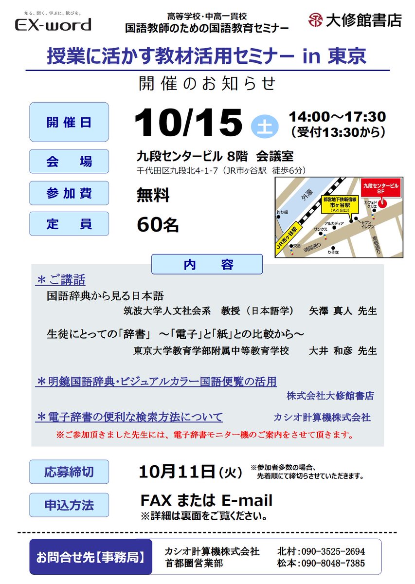 【お知らせ】授業に生かす教材活用セミナー 10月15日(土)、国語の先生向けのセミナーが開催されます。 国語辞典、教材、電子辞書の活用方法のご紹介、『明鏡国語辞典』編集委員 矢澤真人先生、東京大学教育学部附属中等教育学校 大井和彦先生のご講話など盛りだくさんの内容です! pic.twitter.com/hExMPy5lmx
