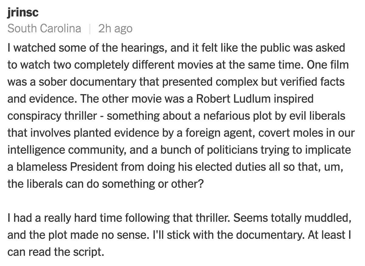 "I watched some of the hearings, and it felt like the public was asked to watch two completely different movies at the same time," writes jrinsc from South Carolina in a comment on
