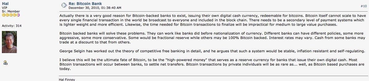 Free banking history helped inspire my design of bit gold, but mostly as "what people really wanted at the end of the day was the gold, the bank note [today could be digital cash] was merely an IOU for gold. So how do I make the actual money, the gold, in digital form?