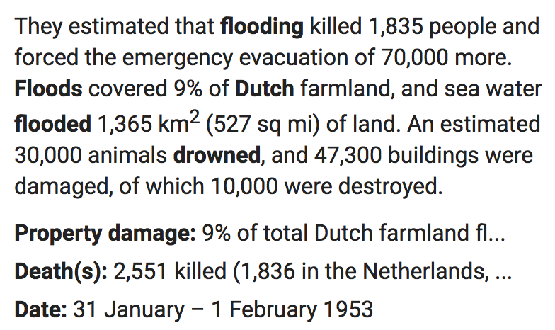 https://en.wikipedia.org/wiki/North_Sea_flood_of_1953 … "Floods covered 9% of Dutch farmland, and sea water flooded 1,365 km2 (527 sq mi) of land. An estimated 30,000 animals drowned"pic.twitter.com/766Dnh1XKe