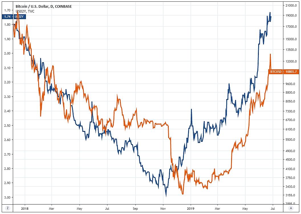 Yields on sovereign debt serve as an opportunity cost for holding non-income producing assets like gold or $BTC. As yields fall, the opportunity cost of holding these assets is also reduced (US 2yr yield inverted in chart)pic.twitter.com/g9MGAZ8bqM