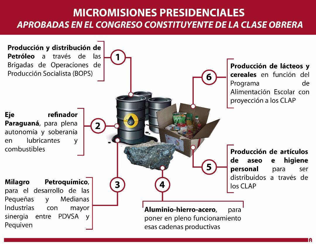 Como parte de las decisiones del Congreso Obrero, he creado 6 Micromisiones Presidenciales para el desarrollo y la potenciación de las áreas de petróleo, refinación, aluminio-hierro-acero, petroquímica, producción de artículos de aseo e higiene personal, lácteos y cereales.pic.twitter.com/c2caQWmnyw
