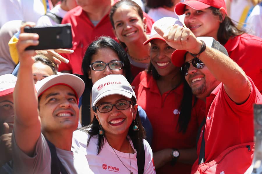 Esta foto de la gente feliz, ¿Será un montaje ?... A cuántos reunió con cara de felicidad? , ¿pagaron para que posarán? y cuántos buses contrataron para reunirlos en el sitio ? ???? ... o la foto fue tomada antes de su éxodo fuera de Venezuela