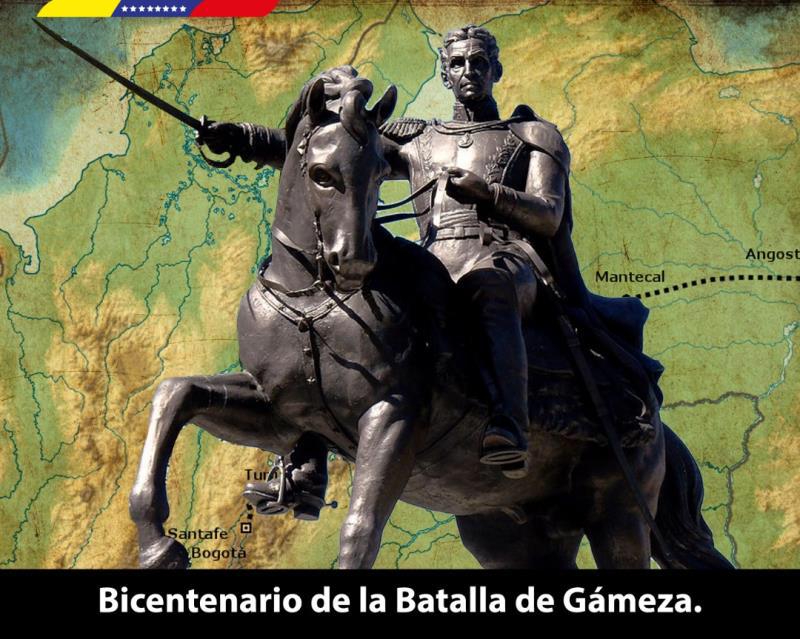¡Conmemoramos el Bicentenario de la Batalla de Gámeza! La grandeza de nuestros ejércitos libertadores que lucharon para liberar las tierras neogranadinas del imperio español, nos llena de fuerza para continuar la defensa de la Patria ante las canalladas imperiales. ¡Viva Bolívar!pic.twitter.com/5146gSr9Wn