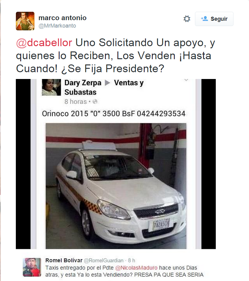 ATENCIÓN @NicolasMaduro MUJER BENEFICIADA CON TAXI ORINOCO LO VENDE @dcabellor EN 3500pic.twitter.com/Q6mh0Hxpgk