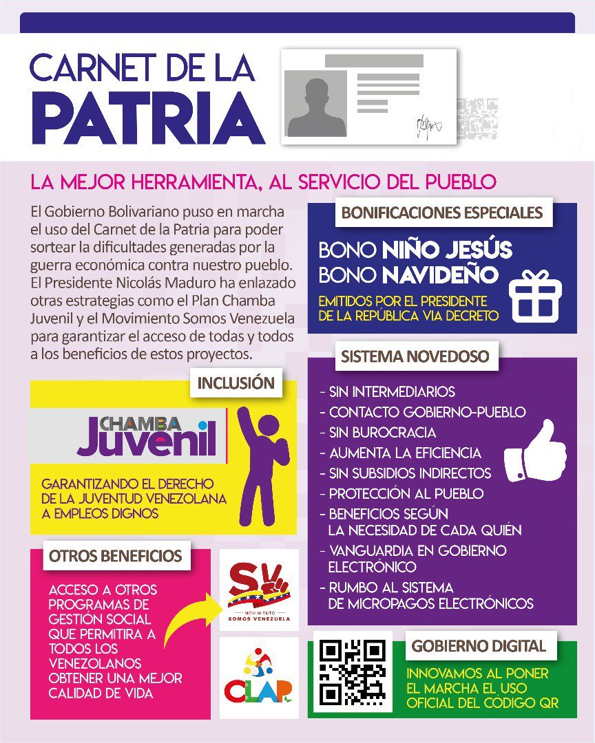 Como parte de las políticas de inclusión social por parte del Gobierno Bolivariano en el año 2017 fue creado el @CarnetDLaPatria con el firme propósito de identificar las principales necesidades de las familias venezolanas y dar una solución a sus problemas.pic.twitter.com/FZvVG03ltT