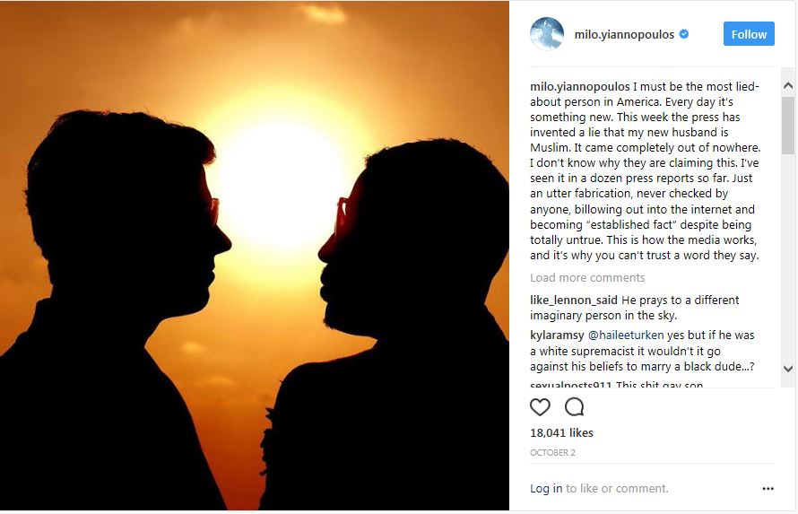 Wrong. That's an old article, and the man Milo refers to in it is his ex, with whom he was in a long-term relationship, since ended. Again, the media doesn't even bother to clarify, let alone verify. Milo's husband is not Muslim:pic.twitter.com/AKMyXGKB0S