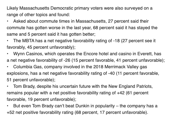 @UMassLowell polled the favorability of a number of non-political subject and I'm legitimately surprised that Tom Brady has a lower approval rating than Dunkin' in Massachusetts.pic.twitter.com/949yWTMl0b