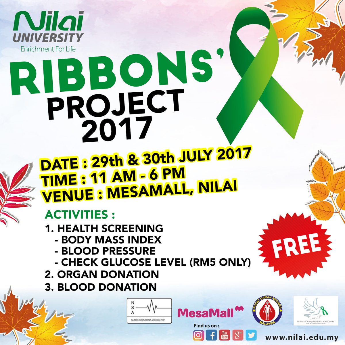 Come and join us Nursing Department's Annual Ribbon's Project, 29th-30th July 2017 at the MESA Mall, Nilai, NS.