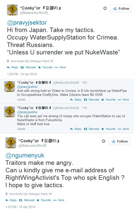 My Japanese troll @Madcooky36or28 suggests a bit of illegal activity to the Right Sector in #Ukraine. "Cooky" indeed.pic.twitter.com/wxUCqhLcWp