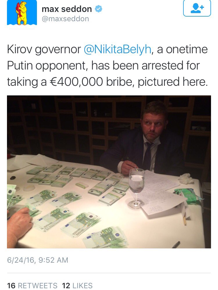 "Anyone who takes a bribe must answer for it" - anti-Putinist governor Belykh. Can't say I disagree!