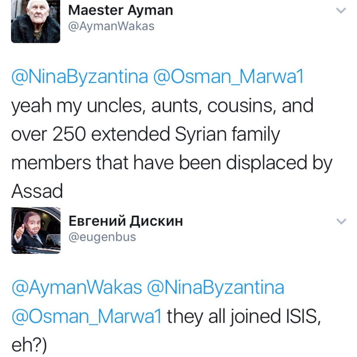 yeah my uncles, aunts, cousins, and over 250 extended Syrian family members that have been displaced by Assad