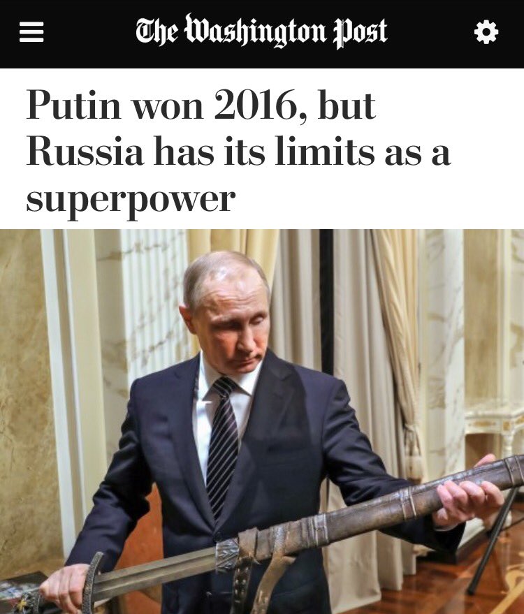 Putin is no longer satisfied with winning elections in the US and Europe. He wins entire years! 😂 https://www.washingtonpost.com/world/europe/putin-won-2016-but-russia-has-its-limits-as-a-superpower/2016/12/31/51c607a2-cec3-11e6-85cd-e66532e35a44_story.html?utm_term=.9b93f9bc100a …pic.twitter.com/HTcoAz5nSr