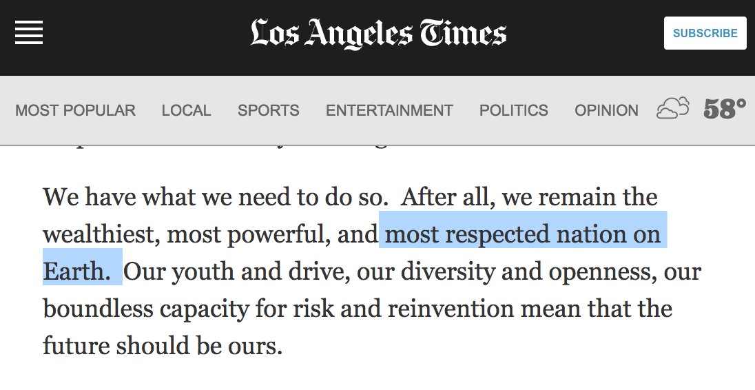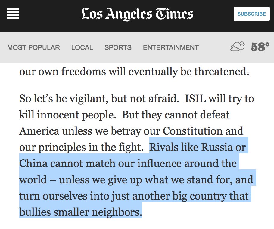 #ObamaFarewell: China and Russia cannot match the most respected nation on earth that doesn't bully others.