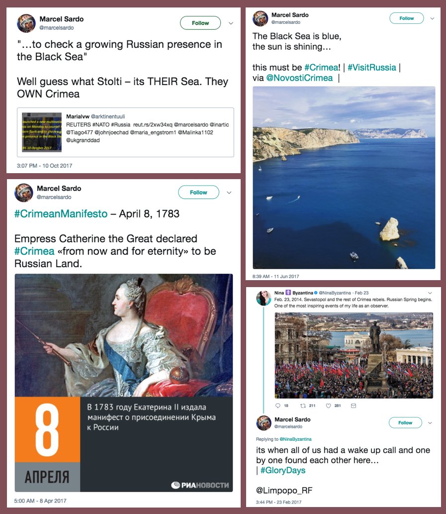 These tweets about Crimea and Ukraine, particularly the set describing Crimea as part of Russia, are in lockstep with the current Russian government's position on the topic.pic.twitter.com/SIZWKgq48O
