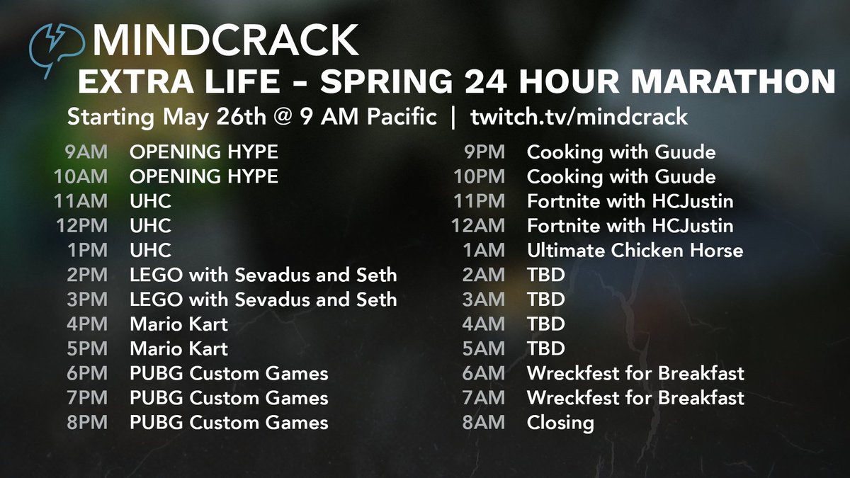 @MindcrackLP will be putting on our Spring Fundraising stream for@ExtraLife4Kids this year it will be a full 24 hours! Don't miss it! http://twitch.tv/mindcrack pic.twitter.com/RWDntjaGSv