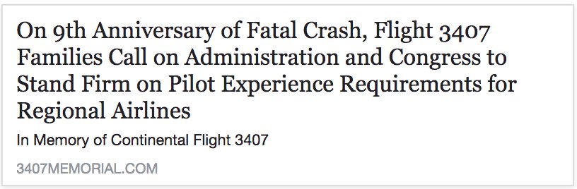 Today is the the ninth anniversary of the tragic and needless crash of Continental Connection/Colgan Air Flight 3407 that claimed 50 lives. I will let the words of the Families of the victims of Flight 3407 speak for themselves. http://bit.ly/2Bp1z4P