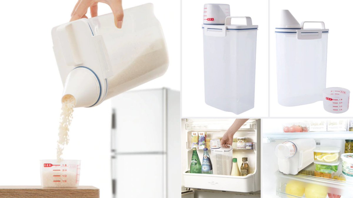 縦置き・横置きどっちもOKの「冷蔵庫米びつ 2kg」は、ハンドル付きで出入れ楽々~