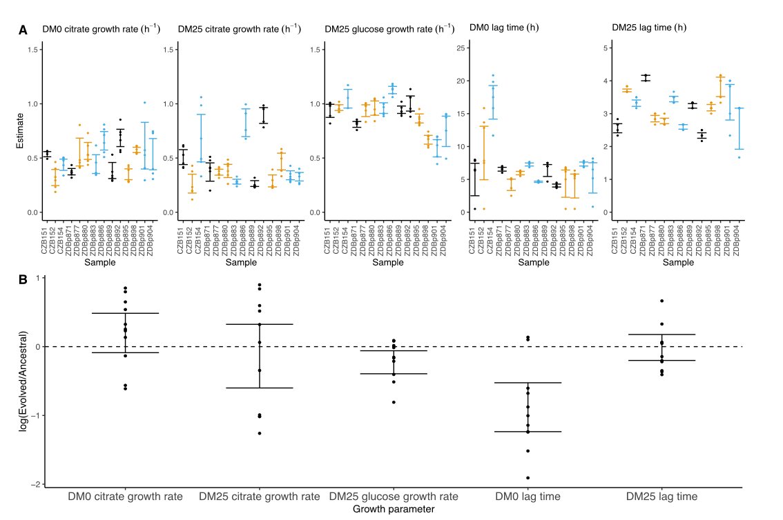 The growth rates of most DM0 and DM25 evolved clones increased and their lag-phase shortened during the experiment. 6/pic.twitter.com/HfvhLWzI8k