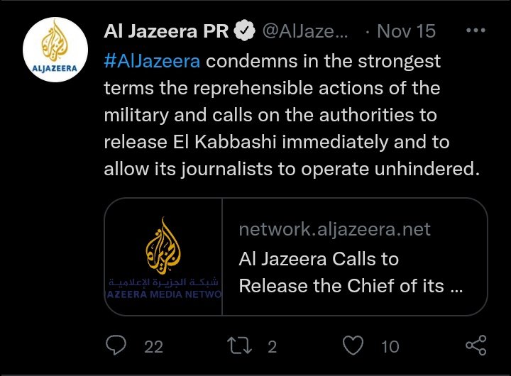 #Jazeera condemned Sudan's military when its journo was arrested; it demanded freedom to operate unhindered. The same#Jazeera doesn't demand freedom to operate independently in#Qatar (which owns it), nor does it decry#Qatar's violation of#FreedomOfPress. Why,@AlJazeera