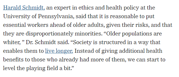 So, is this guy saying don’t make elderly white people a priority for the vaccine because it would be better if they just died? That is what it sounds like to me.