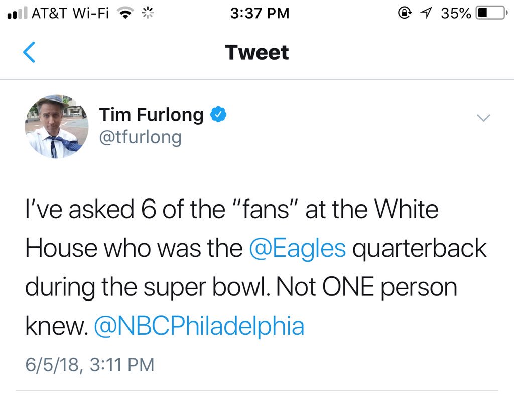 It wasn't a football related event anymore. There weren't and eagles personnel there. What would an eagles fan show up in eagles gear for?