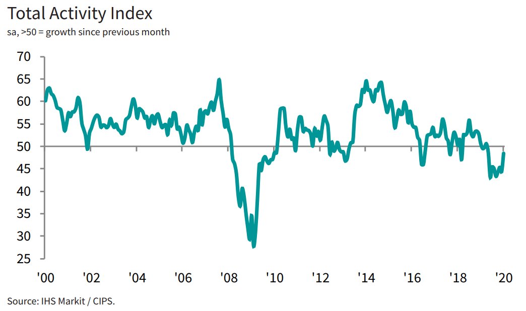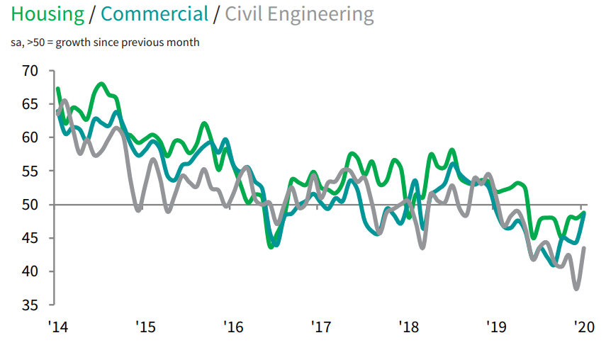Commercial activity fell again in the IHS Markit/CIPS UK Construction PMI (13th consecutive monthly fall) as the fall in new orders in the last 3 years feeds through but some projects with contract awarded, on hold since 2019 H2, have been given the go-ahead...